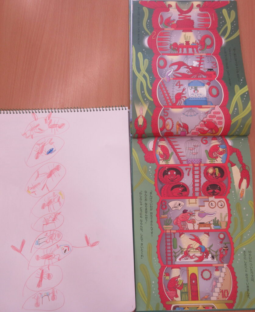 発表会でした「10ぴきのかえる」を結び付けて、描いているお友達もいました。