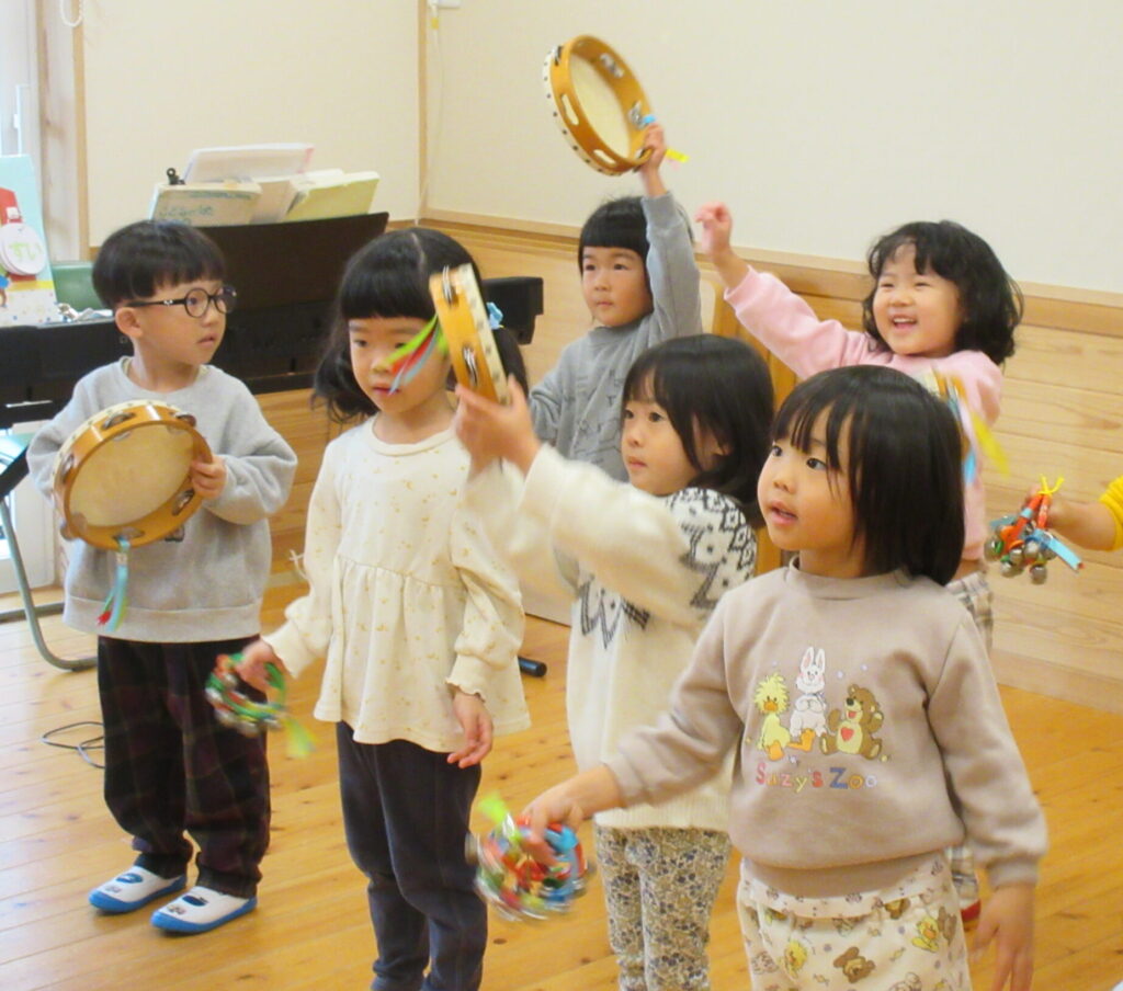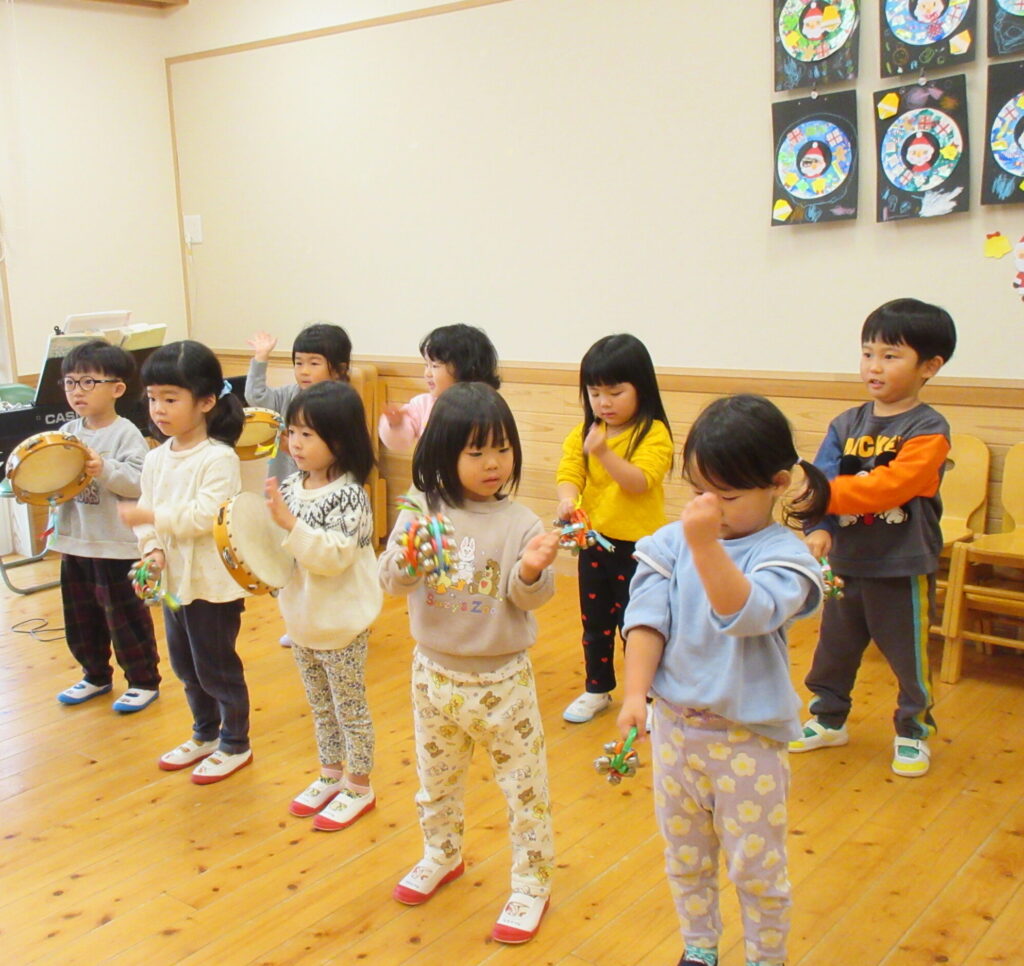 タンバリン、鈴、カスタネットで演奏会をしていました。