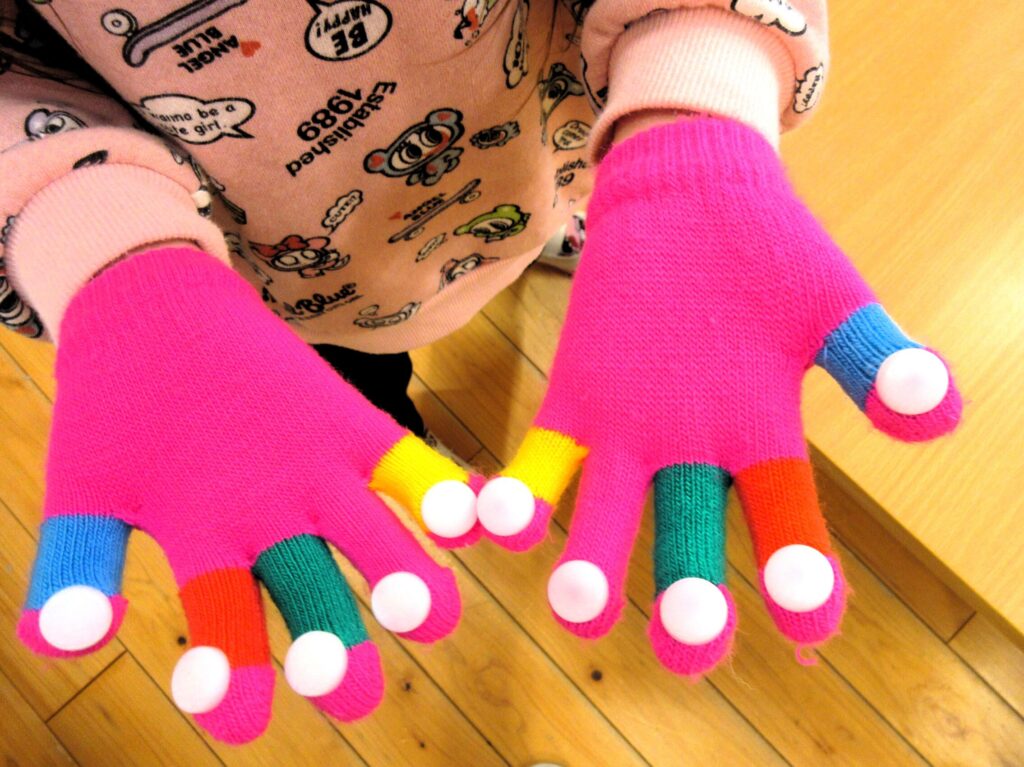 フィンガータップとは、いろんな色の手袋の指先にチップがついて、たたいて音を出します。