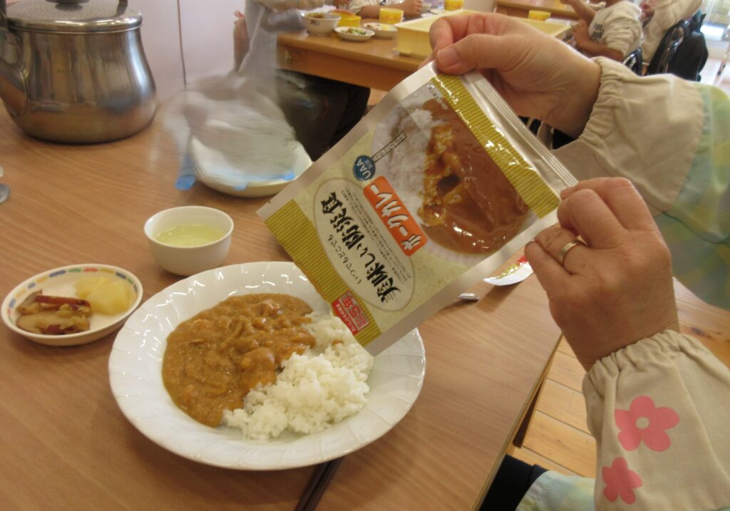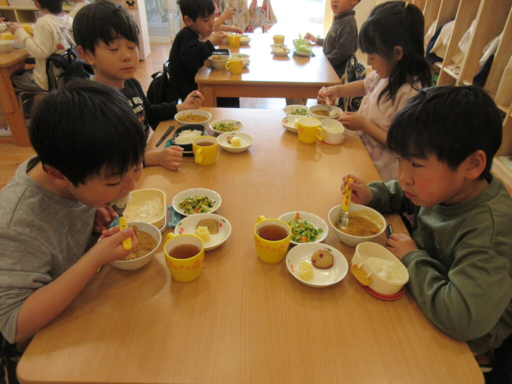 あおぐみさんは、給食先生にいつもの手作りカレーをもらってたべました。