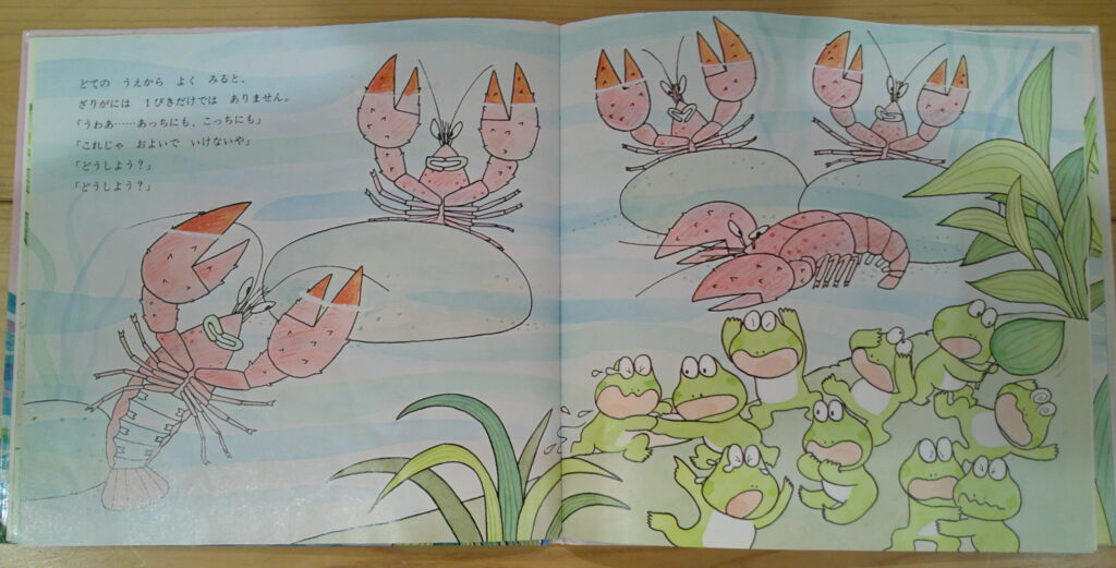 あおぐみさんは、発表会でする劇『10ぴきのかえる』の絵本を聞き、