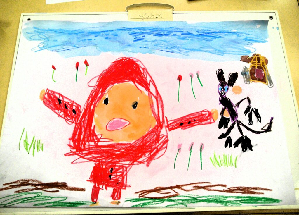 好きなほうの絵を選んで描いてもらったらみんな「あかずきんちゃん」を描きました。
