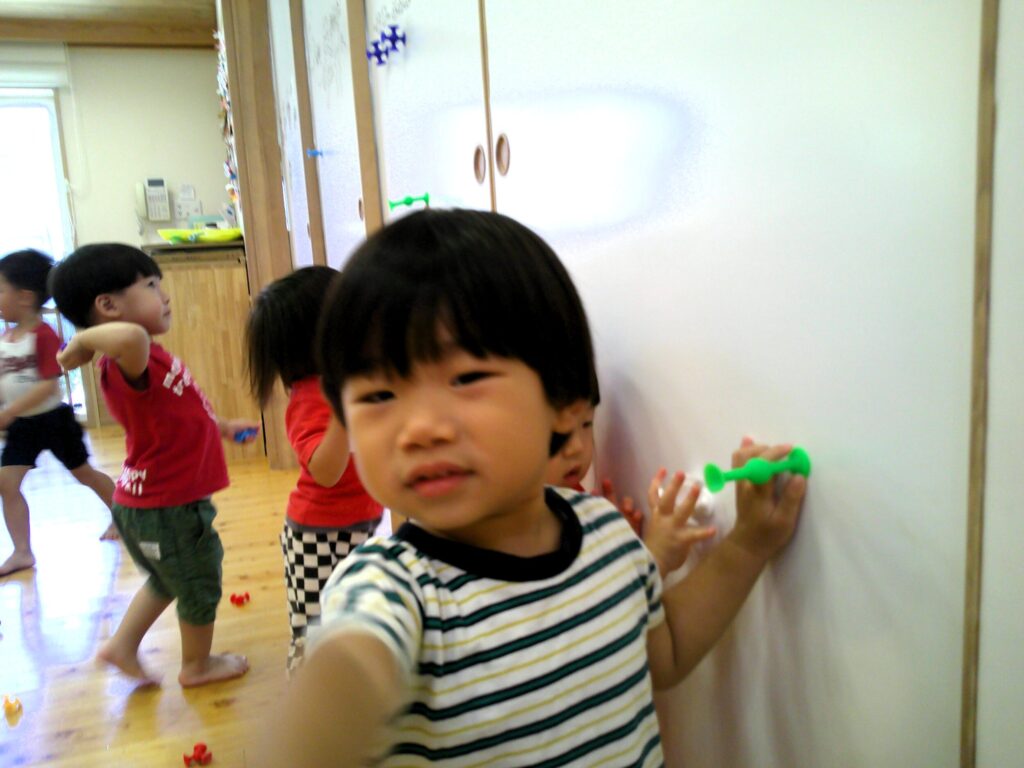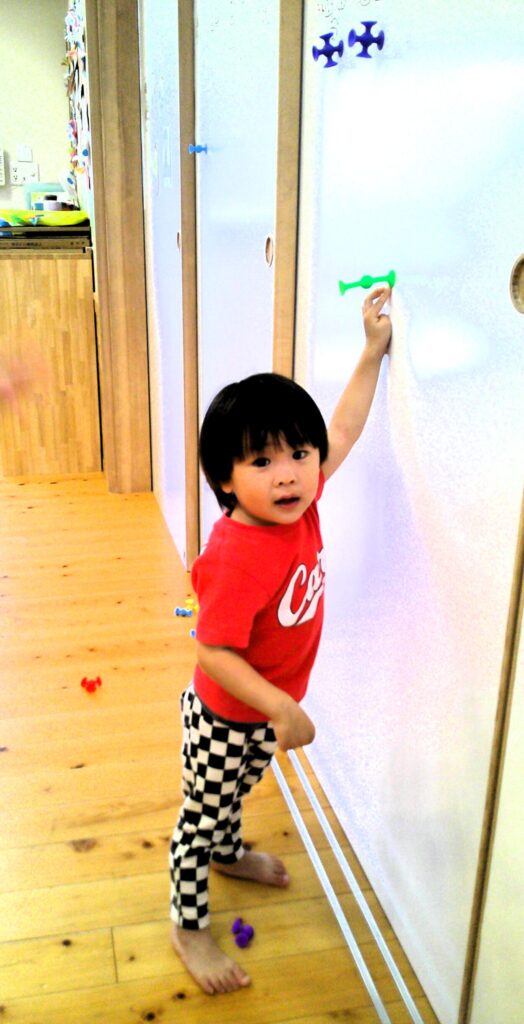 部屋の仕切りがホワイトボードになっているので、吸盤タイプのおもちゃがくっつきます。