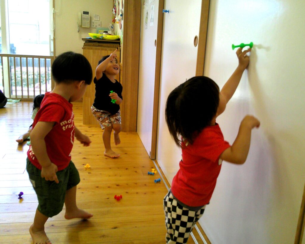壁にくっつけておもちゃ同士をくっつけて、「できた‼」と見せてくれるお友達もいます。