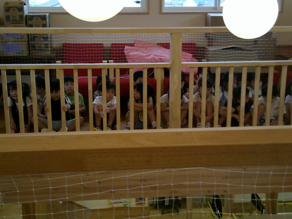 園では、中2階を避難場所に、しろぐみさんからひよこぐみさんが先生とともに