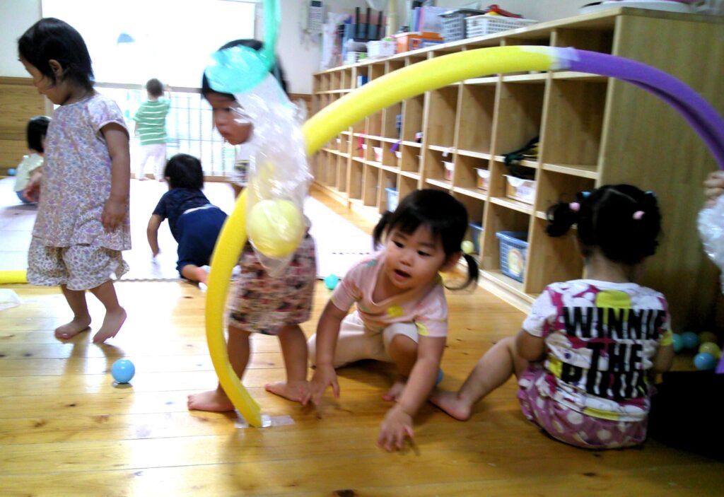 ボールを入れる、なんちゃってバスケ、トンネルを上手にくぐれるかなってしました。
