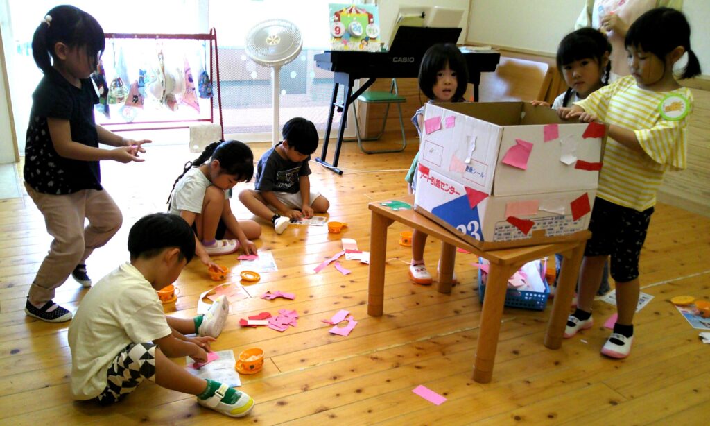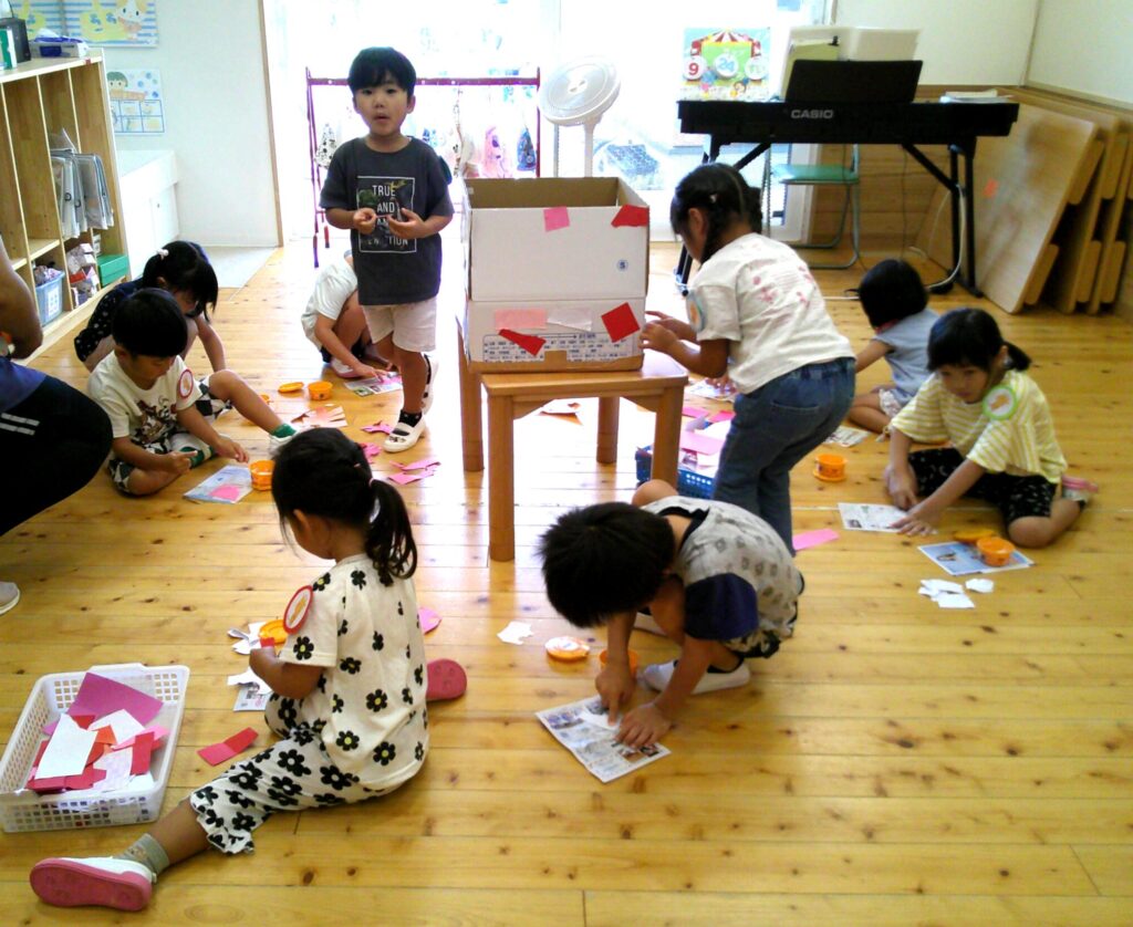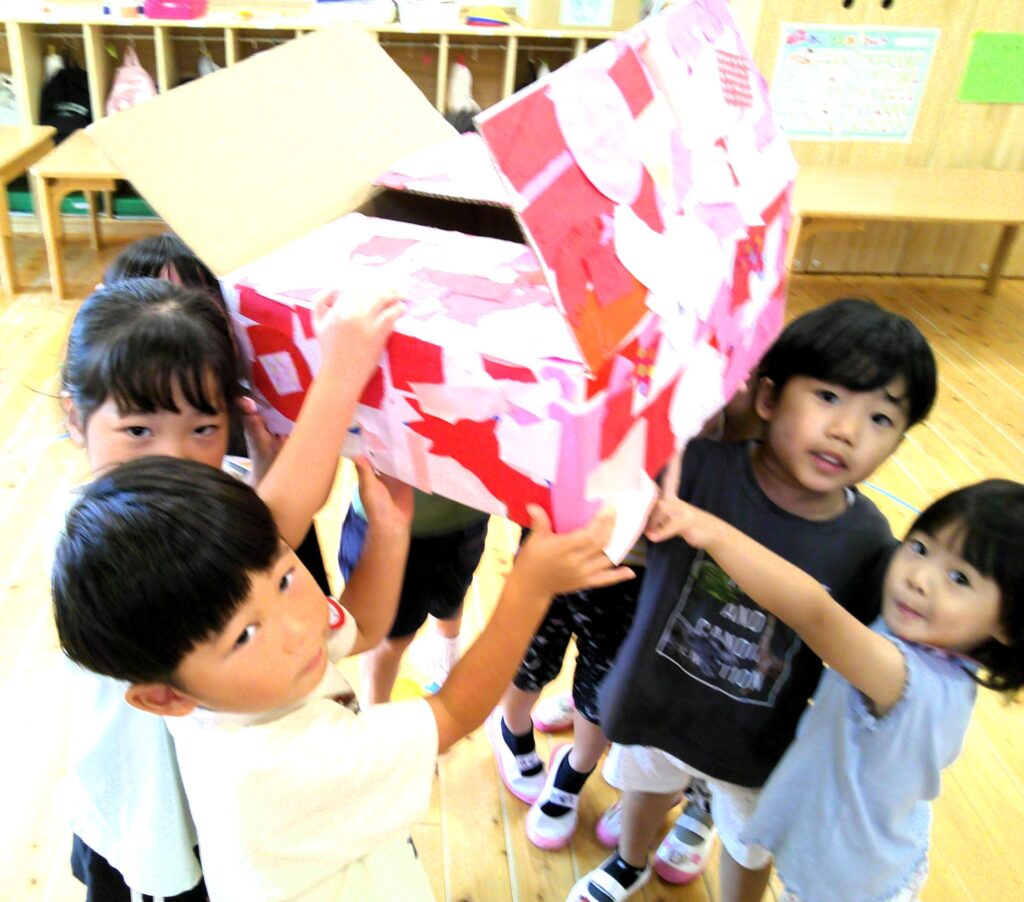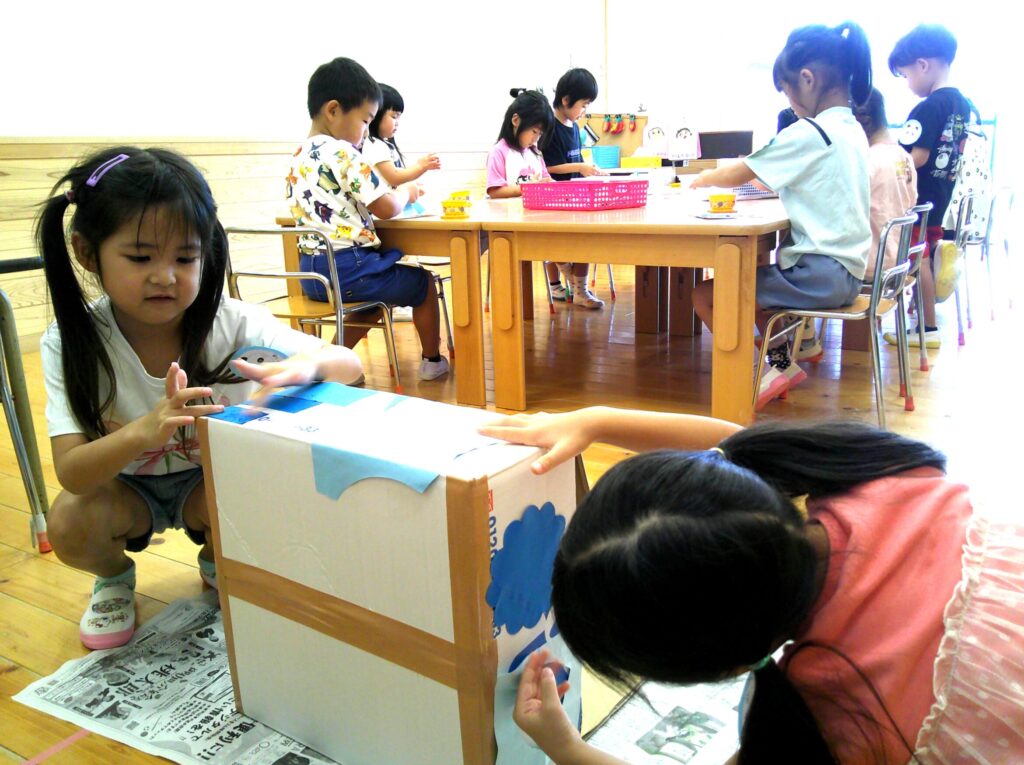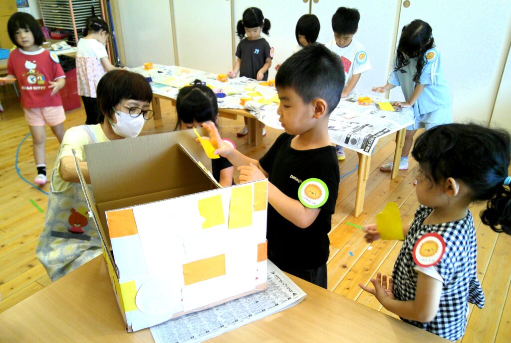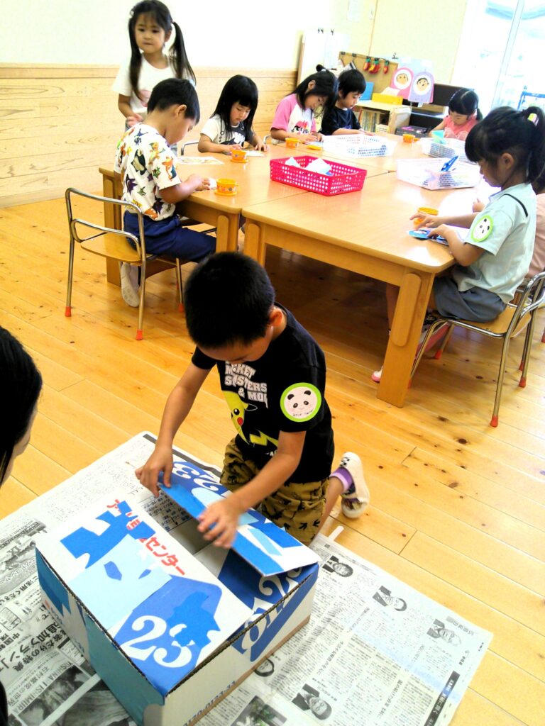 のりで紙を貼っていきチームカラーのオリジナルの箱を完成しました。