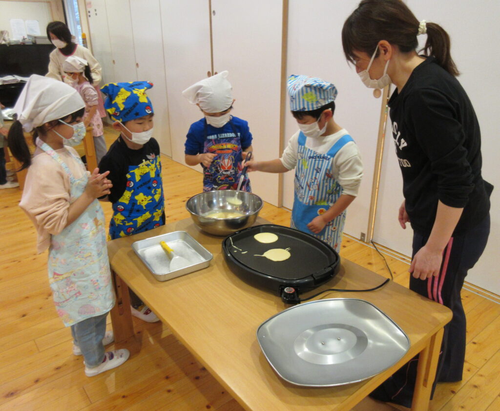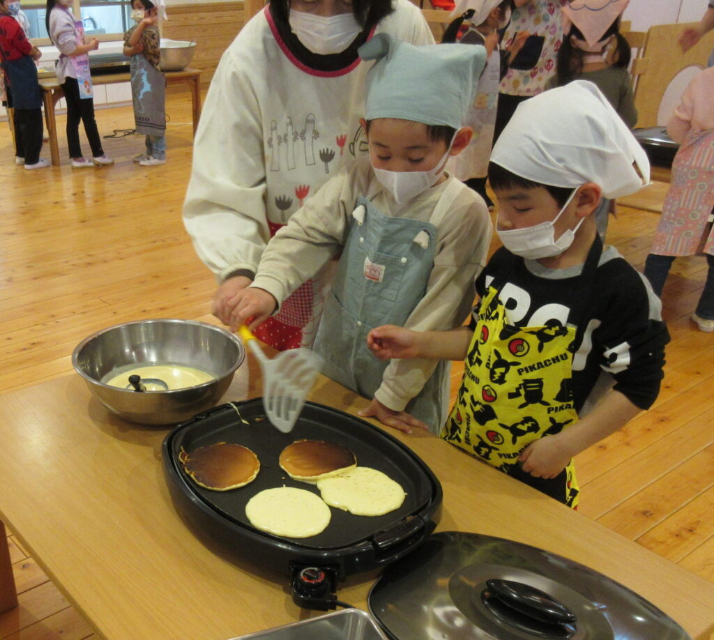 絵本の『しろくまちゃんのほっとけーき』が料理の手本です。