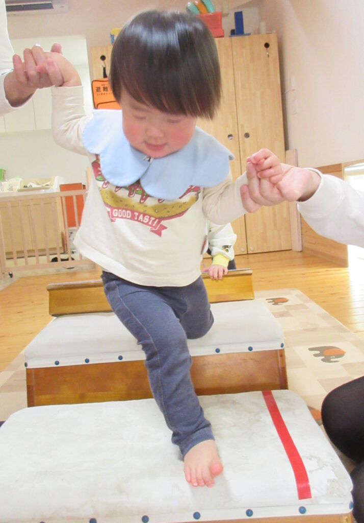 先生に手をつないでもらって、段差を歩く遊びと