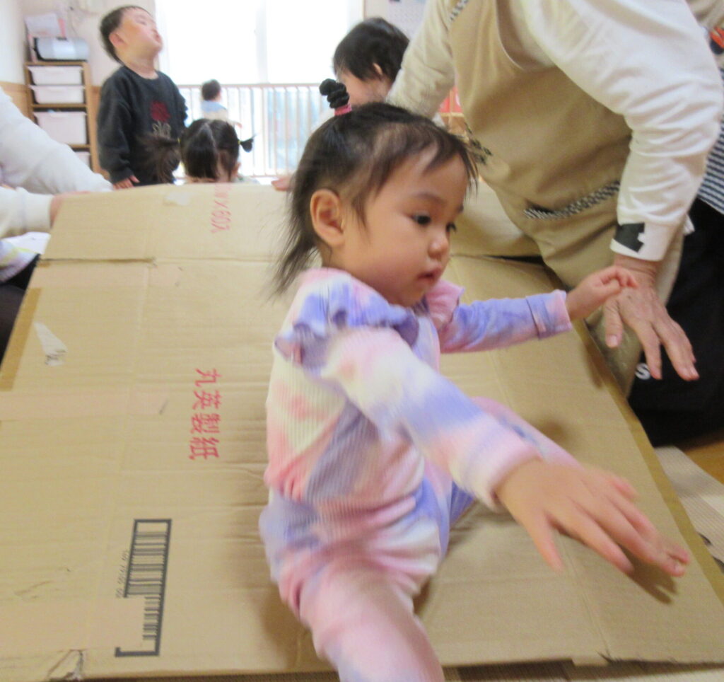 すべる遊びをお部屋でしました。ぶつからないように、一方通行でします‼