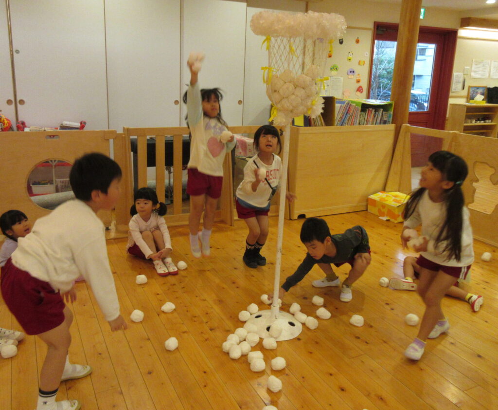 幼児ぐみさんは、縦割りで体操をして、玉入れ遊びで盛り上がりました。