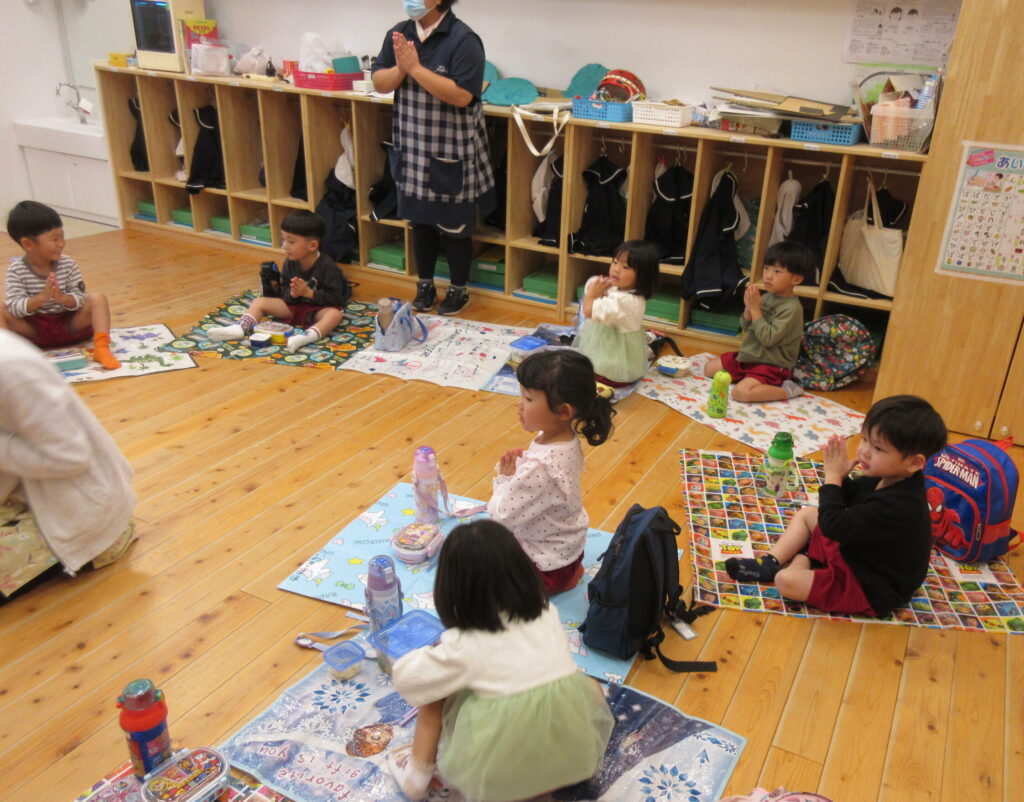 ホールで、レジャーシートを広げて、みんなで「いただきます🥢」って