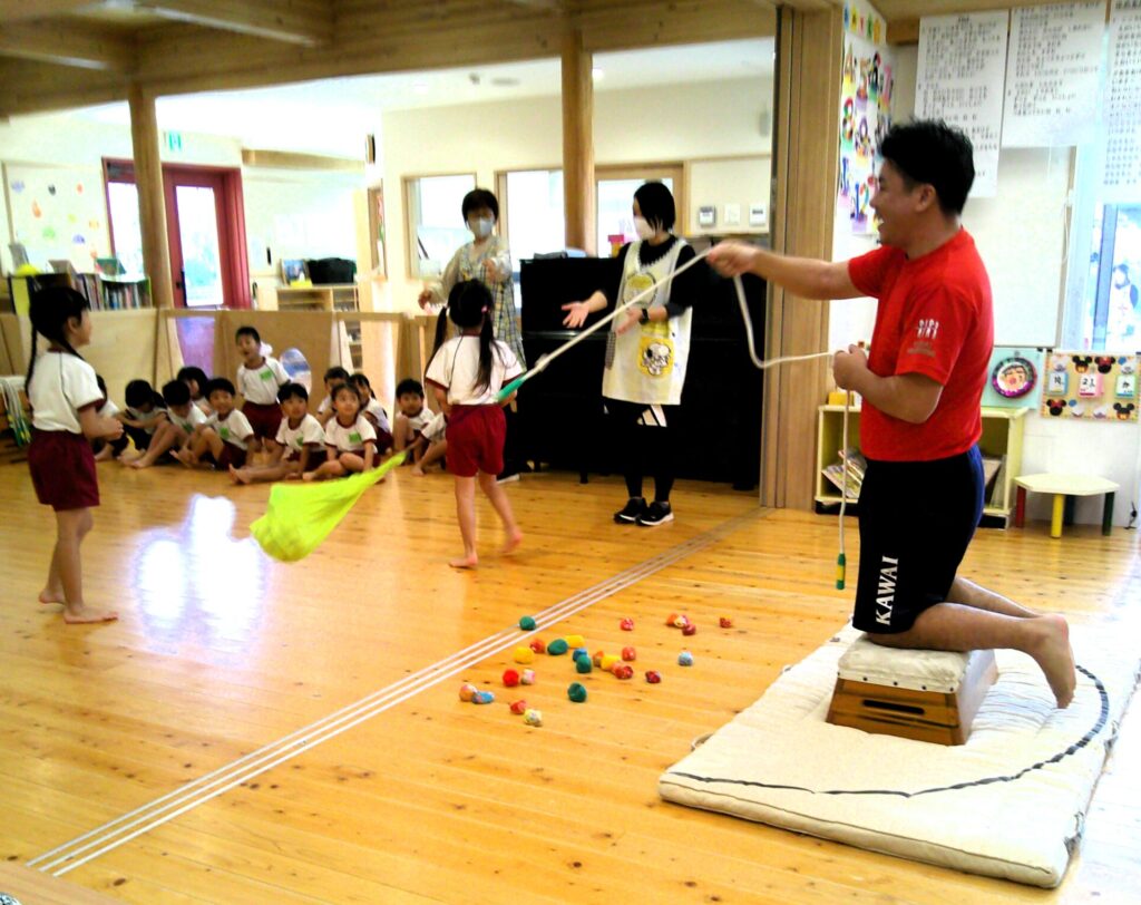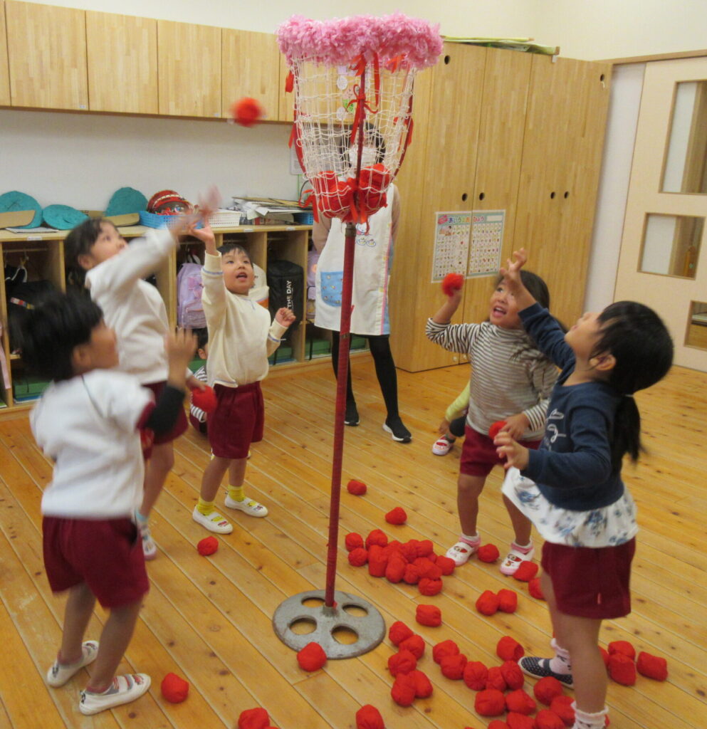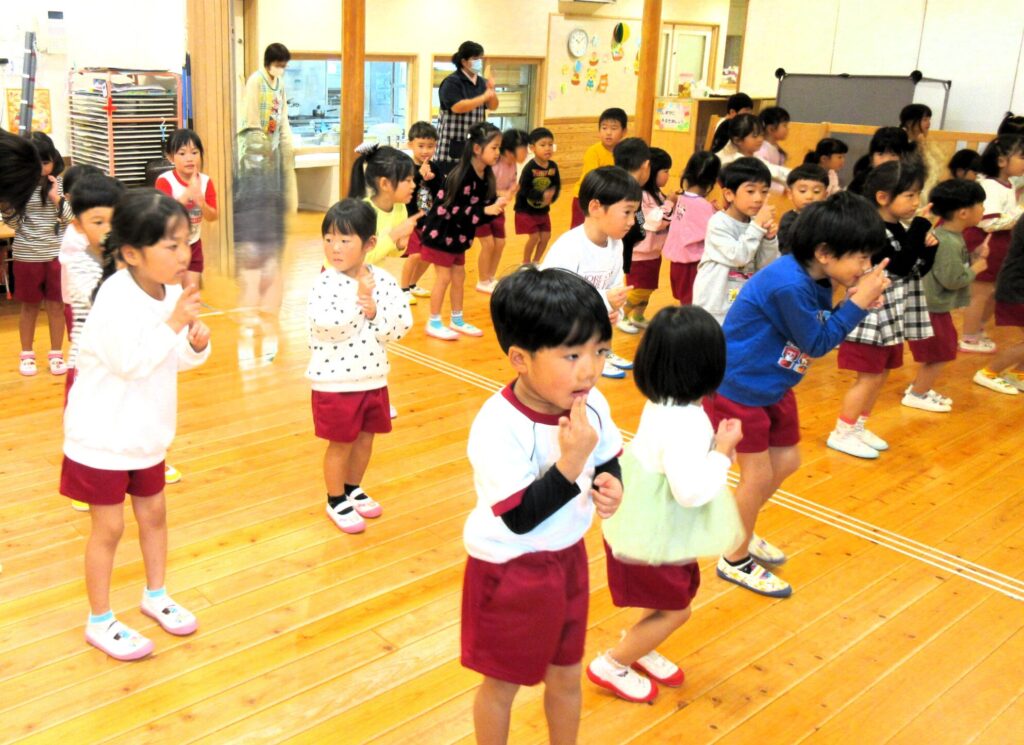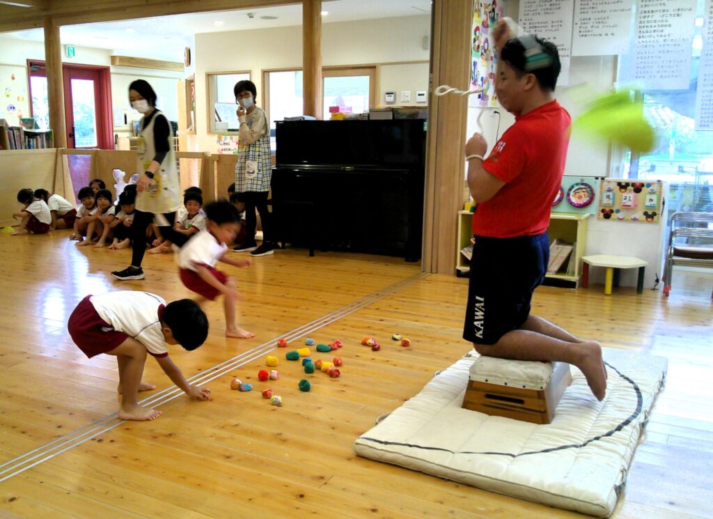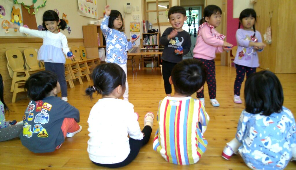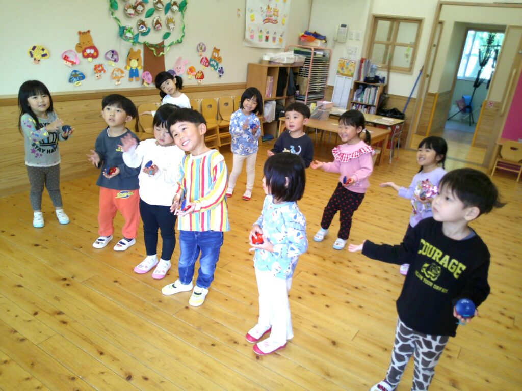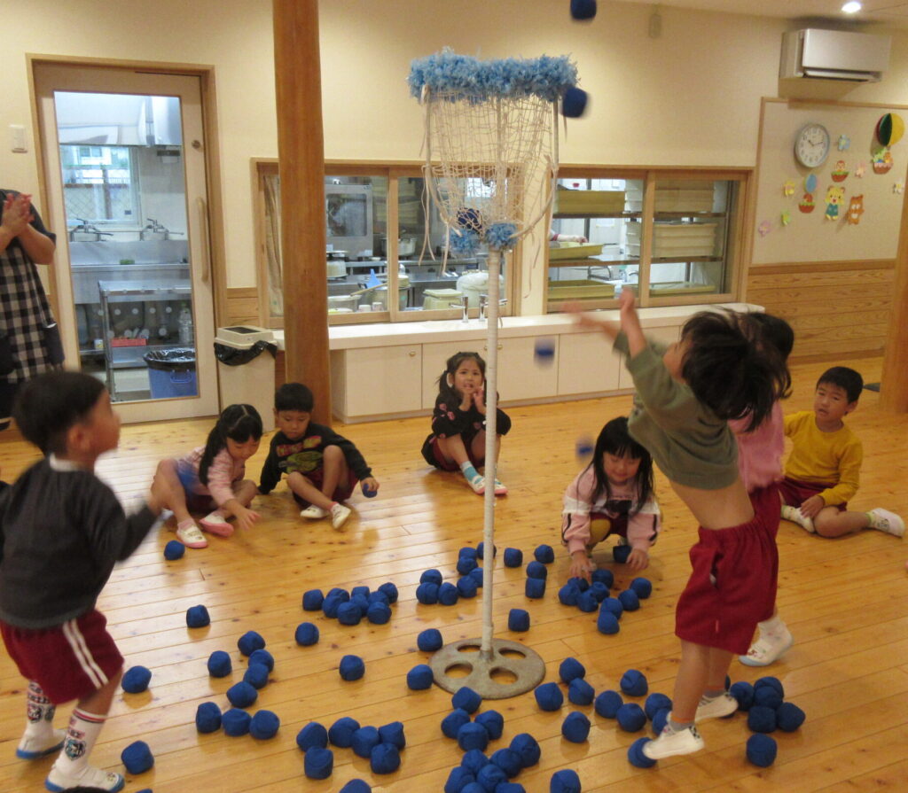 幼児ぐみさんは、縦割りで体操をして、玉入れ遊びで盛り上がりました。