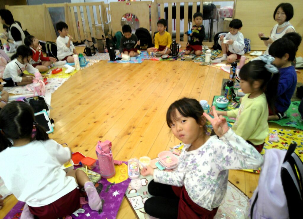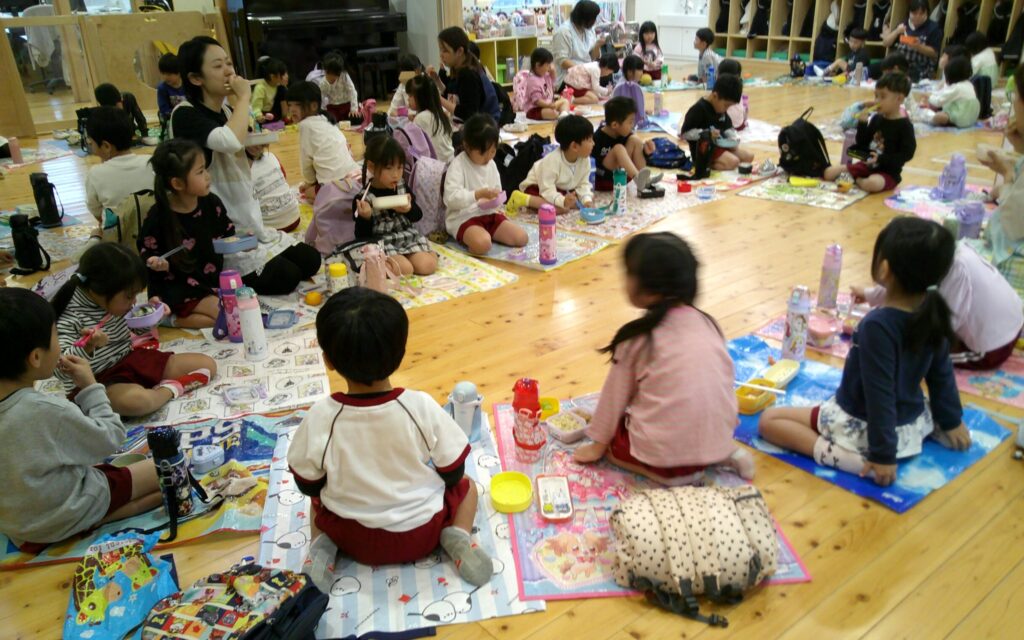 ホールで、レジャーシートを広げて、みんなで「いただきます🥢」って