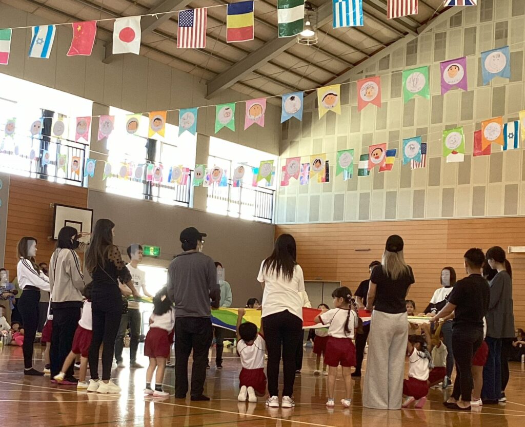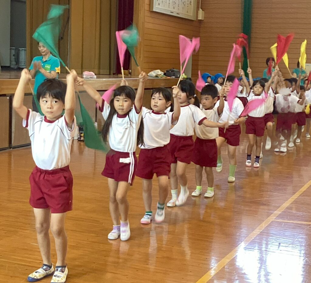 音楽に合わせて、旗を上げ下げしたり、みんなと動きを合わせて仕上げました。