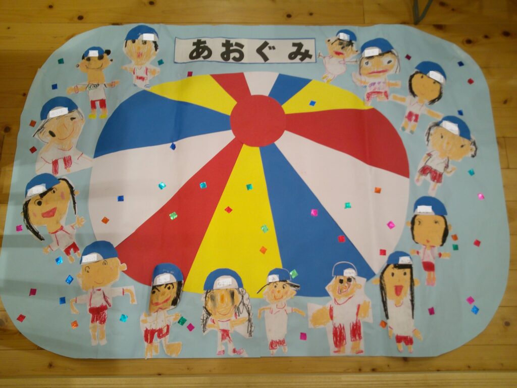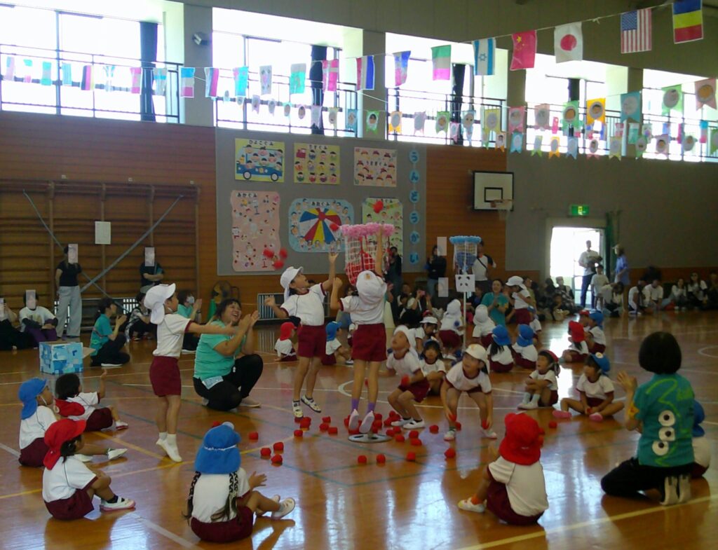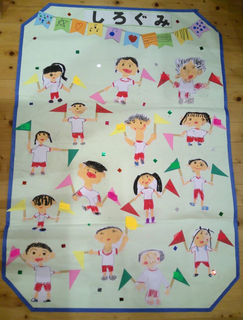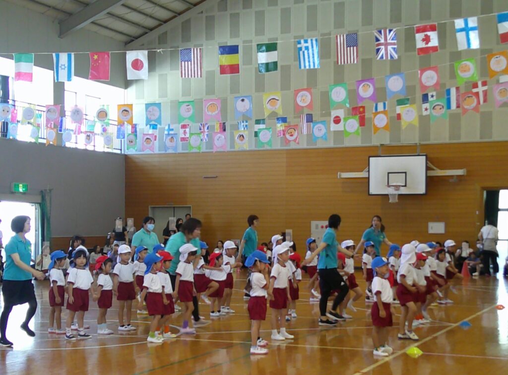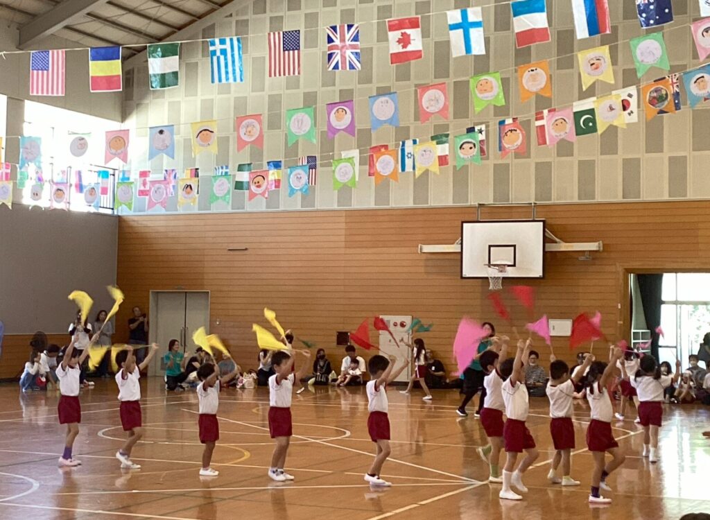 音楽に合わせて、旗を上げ下げしたり、みんなと動きを合わせて仕上げました。
