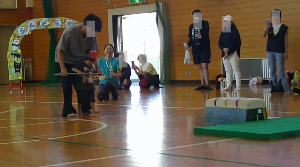 緊張もとけて、親子でフープに入り、ジャンプ、バーをくぐり、